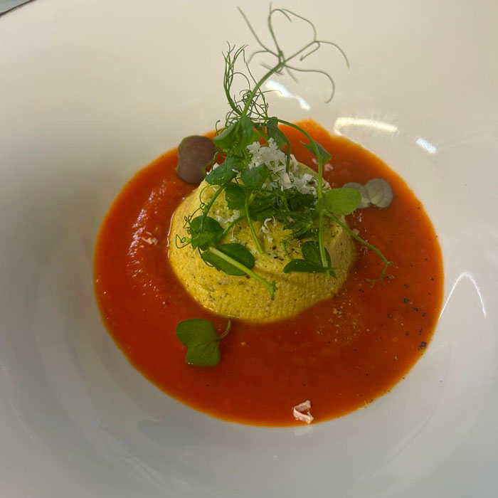 Piatto di servizio cappello del prete : metti il pomodoro e lo batti sotto cn la mano , ci poggi il tortino dentro e sopra chiudi con germogli di pisello e ricotta dura salata.