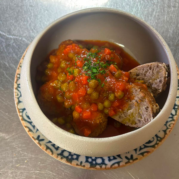Piatto di servizio ciotola cn bordo , adagia un crostone di pane sul fondo e versa le 5 polpette cn sugo