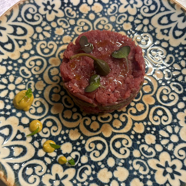 Poggiate la tartare sul piatto e chiudi con cappero sopra e laterale al piatto fai 4 punte di senape a scalare