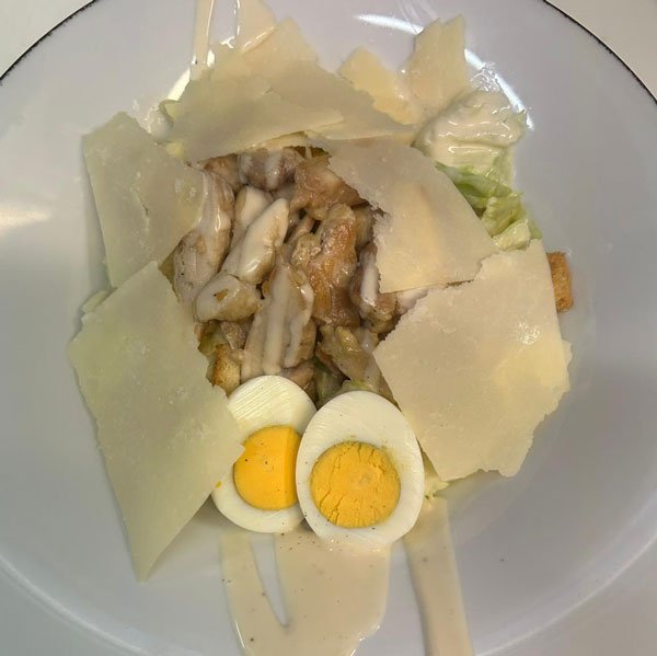 Aggiungi 6/7 crostini di pane intorno , appoggia il pollo cotto precedentemente al centro del piatto sopra l’insalata, disponi intorno n4 pezzi di scaglie di parmigiano e sul laterale 1 uovo sodo in 2 e chiudi cn una striscia centrale di salsa Caesar