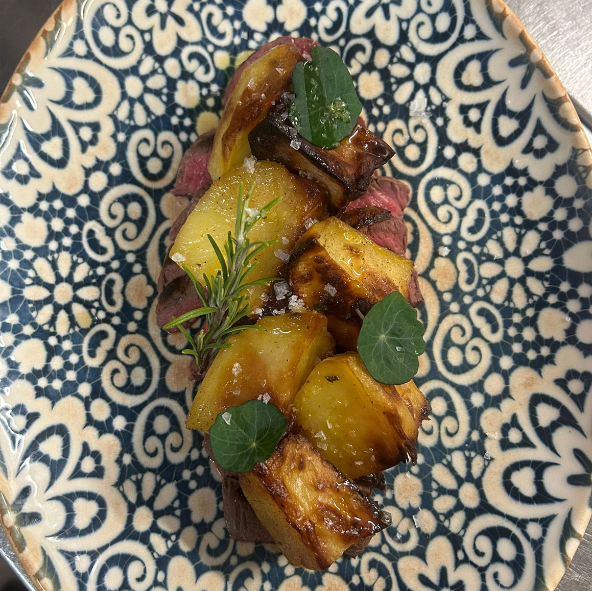 Piatto di servizio ovale lungo, adagia la tagliata sopra e posiziona 7 patate precedentemente scaldate in forno per 5 min,chiudi con rosmarino e nasturzio